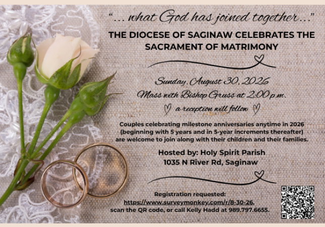"...what God has joined together..." The Diocese of Saginaw celebrates the Sacrament of Matrimony. Couples celebrating milestone anniversaries anytime in 2026 (beginning with 5 years and in 5-year increments thereafter) are welcome to join along with their children and their families. Registration is requested using the link above or by calling Kelly Hadd at 989.797.6655.